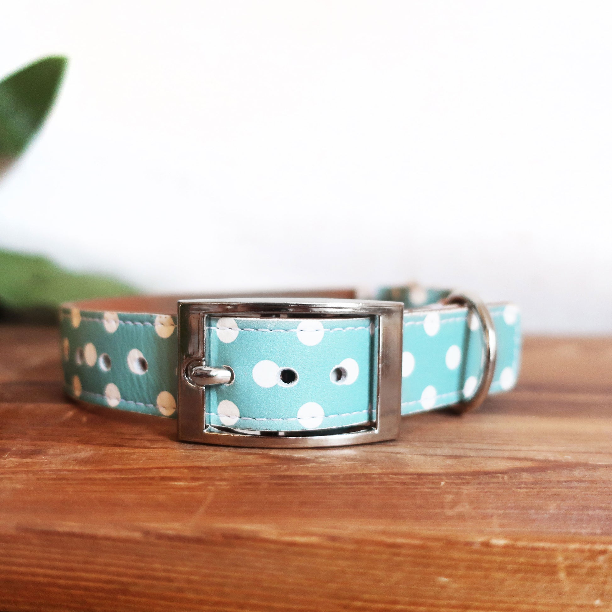 We love this full leather blue dog collar for brightening up walks with lovely dogs! This fun yet beautiful dog collar, paired with classic chrome hardware, looks great on any dog all year round.