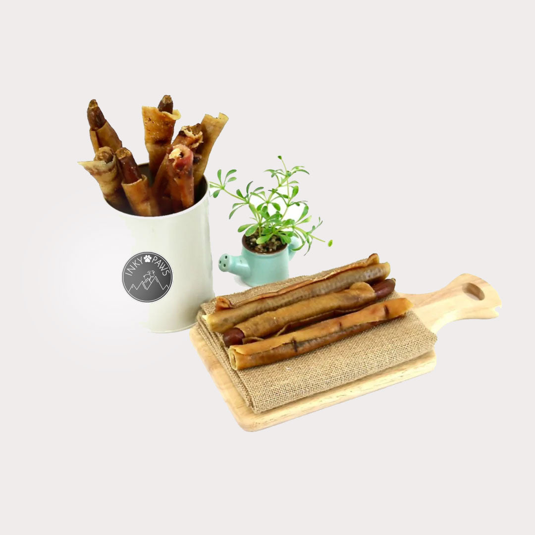 Our Sausage rolls- gourmet chicken sticks, wrapped in pork rind, loved by dogs of all shapes and sizes. They are slow roasted in their own juices to ensure a mouth watering taste in every bite!